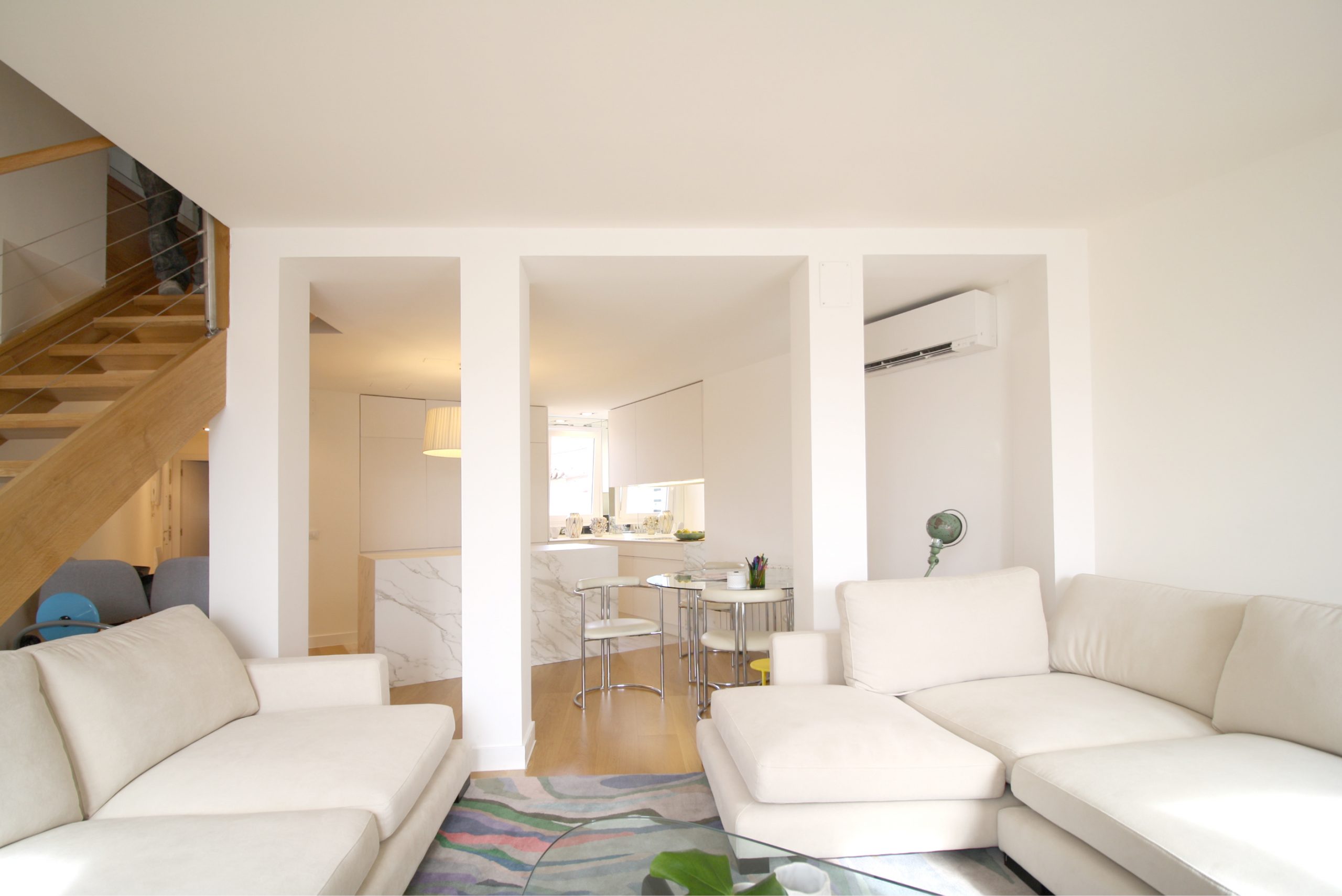 El proyecto de reforma consiste en crear un espacio agradable en planta baja que cuente con una zona más social de estar con cocina abierta al salón por una parte y con un espacio de baño con vestidor secreto por otra parte dentro de una vivienda dúplex de nueva construcción con un suelo y escalera a estrenar que se decide mantener, al igual que las habitaciones del piso superior.