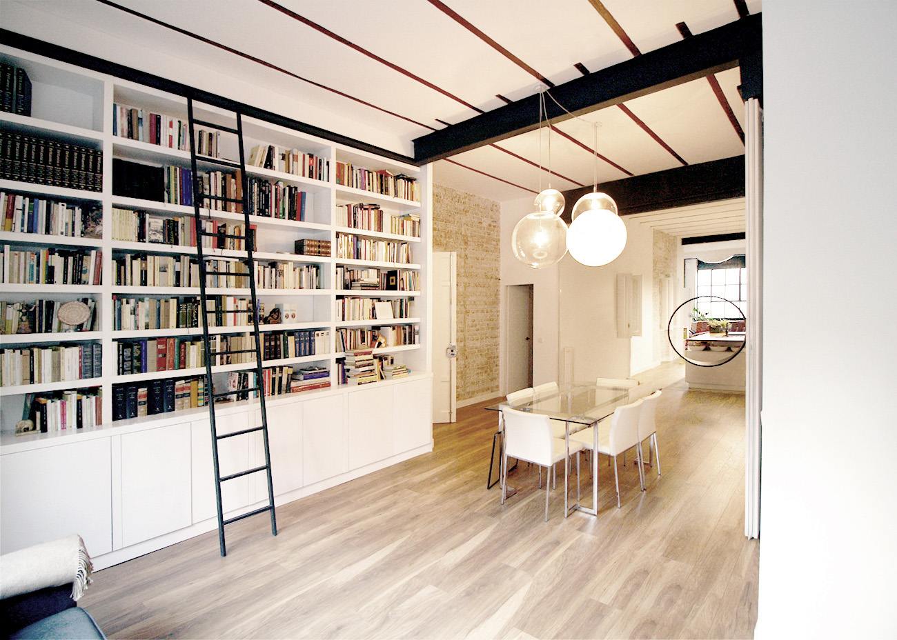 La vivienda con una parte dedicada a academia particular se ubica en el antiguo almacén de una residencia militar posteriormente reconvertida en oficinas. El espacio se entiende como un todo continuo, con reminiscencias al carácter industrial de la construcción original, donde los espacios privados, se sitúan en compartimentaciones contiguas a un gran espacio abierto y continuo en el que conviven usos domésticos y docentes en una atmósfera industrial común. Los elementos estructurales se descarnan y quedan vistos, al igual que los muros originales, donde se recupera el ladrillo macizo de algunos paramentos. Parte del suelo original de baldosín hidráulico se rescata como alfombra para el comedor junto con una nueva tarima de roble cepillado. Las molduras originales del salón se reparan coexistiendo con luminarias LED y lámparas descolgadas de lenguaje actual.