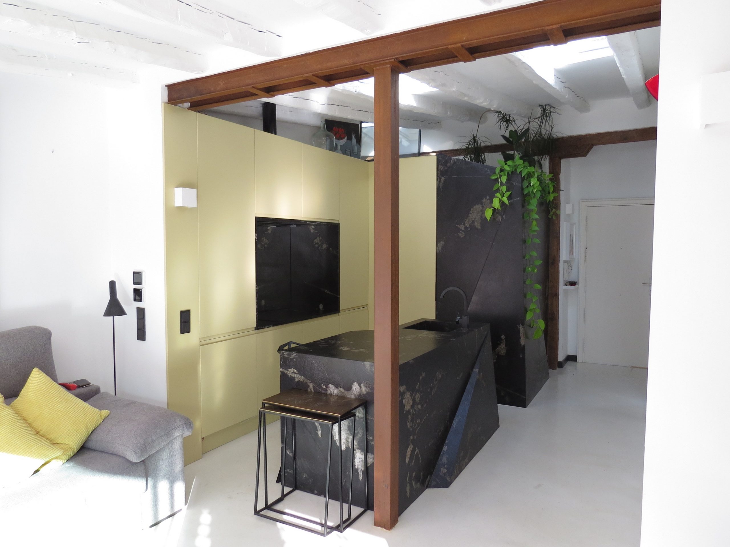 La vivienda resultante optimiza el espacio eliminando falsos techos, sustituyendo muro de carga por vigas y pilares, y abriéndose a