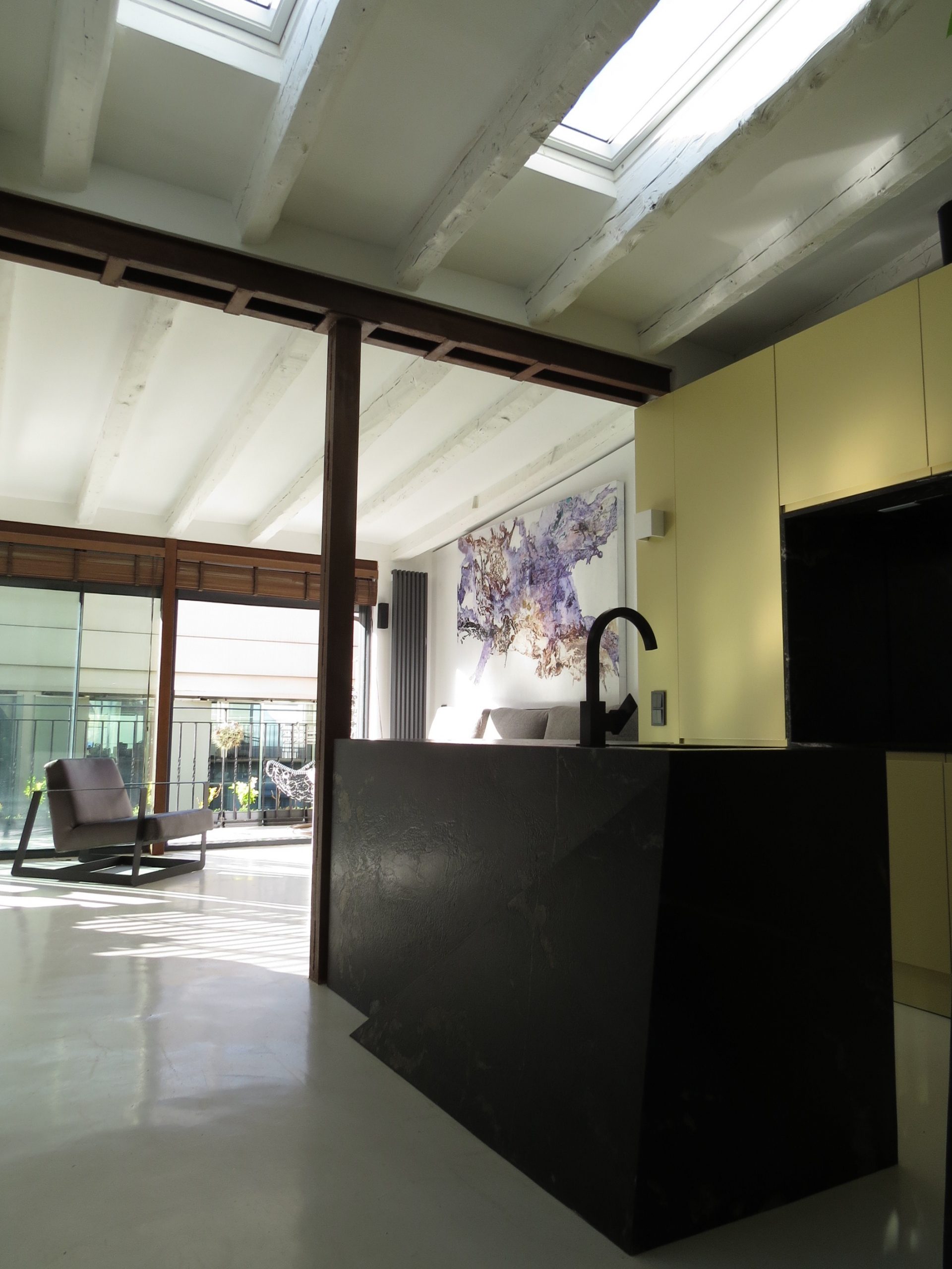 microcemento en vivienda y terraza y un color blanco de los paramentos horizontales tanto en suelo de microcemento como en