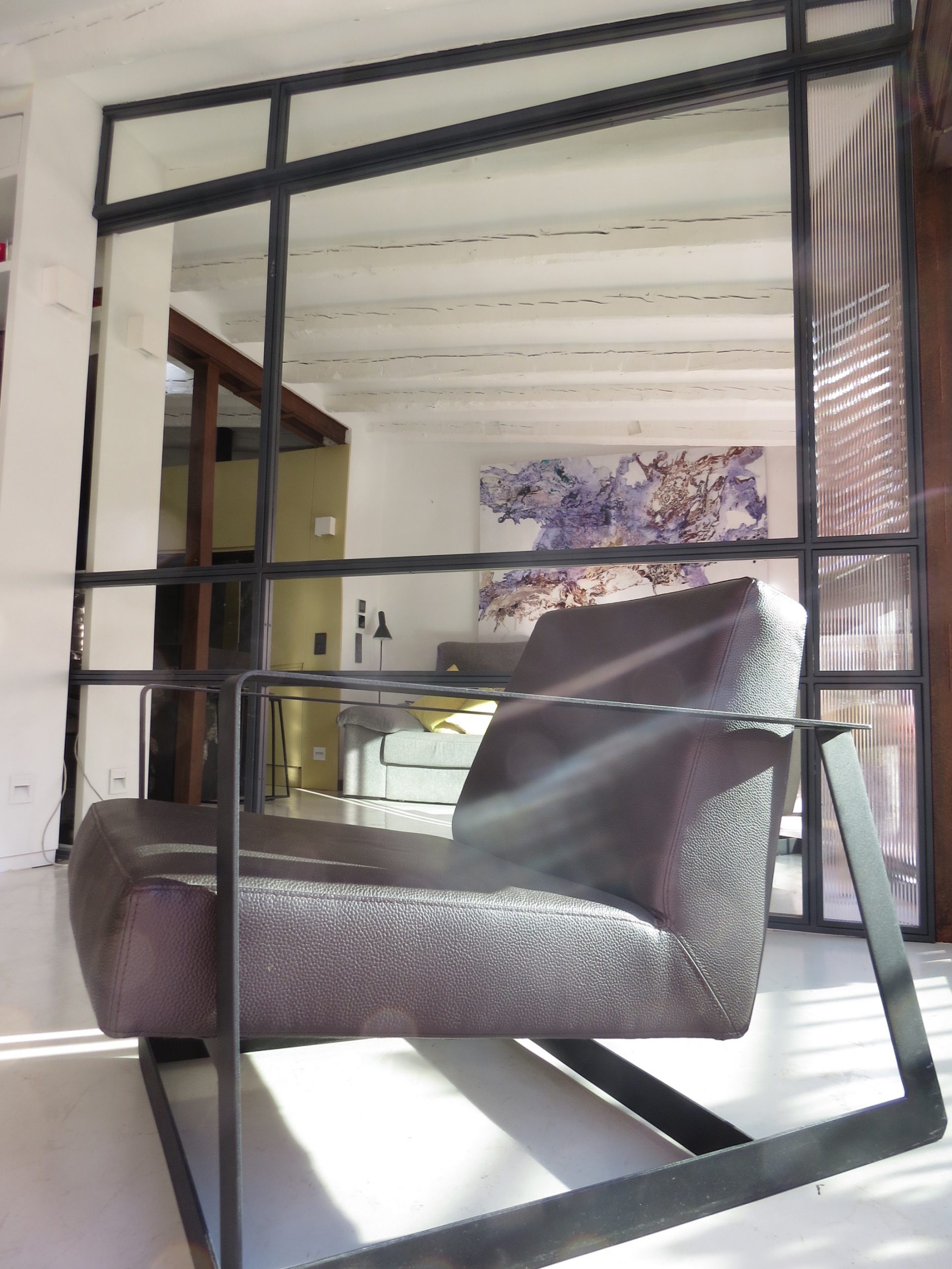 vigas sacadas a la luz del techo que contrasta con el marrón de las maderas y hierros oxidados de la estructura vertical vista.
